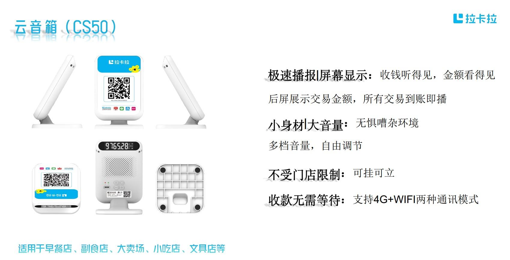 拉卡拉收錢(qián)云音箱(CS50) 拉卡拉支付 3年前 ( 2023-04-14 ) 6782 拉卡拉收錢(qián)云音箱(CS50)極速播報(bào)-屏幕顯示:收錢(qián)聽(tīng)得見(jiàn),金額看得見(jiàn)后屏展示交易金額,所有交易到賬即播小身材-大音量:無(wú)懼嘈雜環(huán)境多檔音量,自由調(diào)節(jié)不受門(mén)店限制:可掛可立收款無(wú)需等待:支持4G+WIFI兩種通訊模式