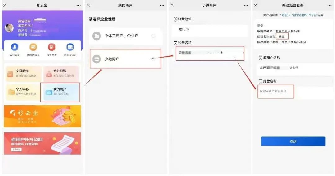 杉德POS機修改商戶名稱教程 拉卡拉 2年前 ( 2023-10-27 ) 890 杉德 杉德POS機修改商戶名稱教程:杉德杉云寶公眾號,左下角注冊登錄(賬號密碼登錄,賬號手機號,密碼身份證后六位,選擇微信快捷登錄);登錄后首頁--點擊我的商戶--選擇商戶類型--點擊經營名稱下面的商戶名稱--按舉例修改經營名稱每次修改商戶經營名稱周期為30天。一機一碼逐步落地,支付公司目前已出的對策有兩種:讓客戶安裝一桌子抽屜的機器;每刷一筆然后到APP修改一次商戶名稱。根據目前已固定一機一戶的支付公司產品,如何更換商戶,小編做了一個匯總,有需要的可以看下: The End 標簽:博主很懶,并沒有設置標簽