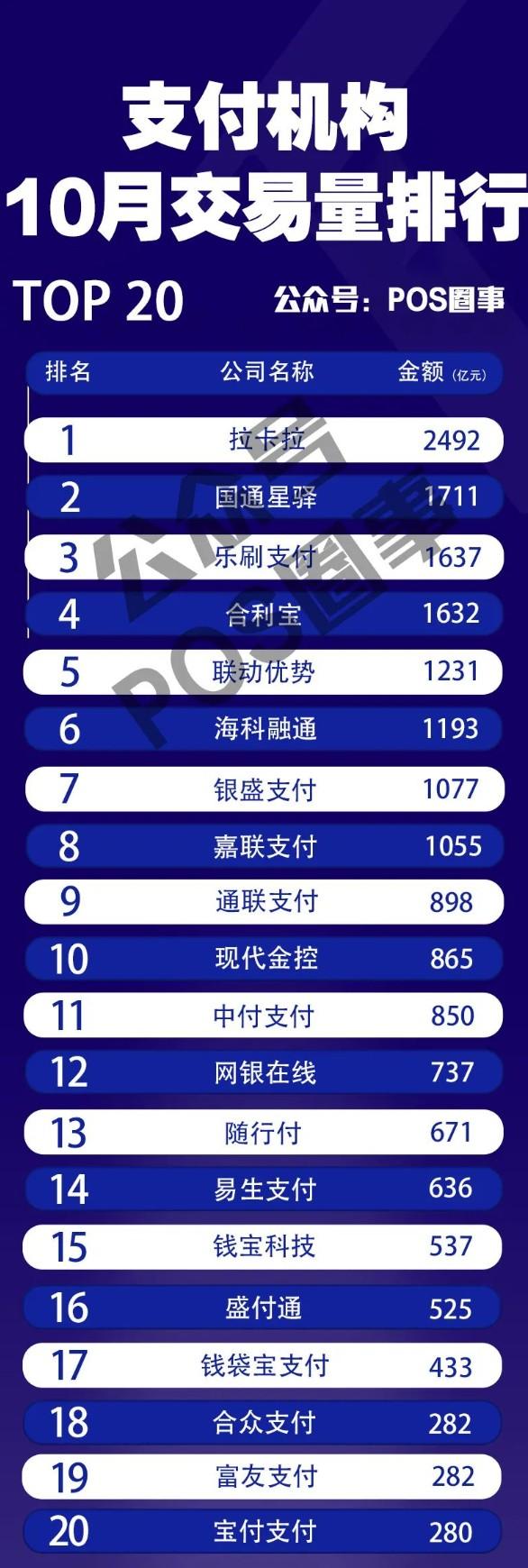 2023年10月份各支付公司交易量排名公布 拉卡拉 2年前 ( 2023-11-16 ) 642 近日,一張支付圈第三方支付10月份交易量排行榜刷爆朋友圈,如下圖:從排名上來看,拉卡拉、國通、樂刷前三甲,拉卡拉月交易量2492億。國通月交易量1711億。樂刷交易量1637億。同比上個月拉卡拉、下跌138億元。 The End 標簽:博主很懶,并沒有設置標簽