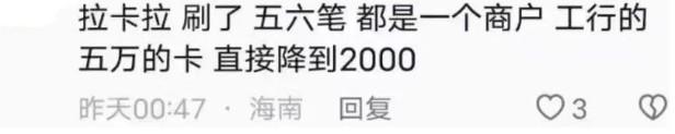 昨天剛有一個持卡人,用大哥的機器刷卡,五六筆都是顯示同一個商戶消費,工行額度五萬的信用卡,直接降額至2000!