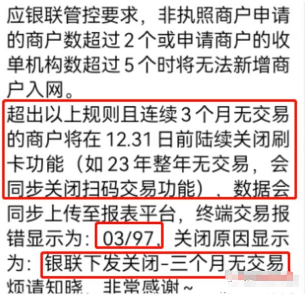 由于銀聯的管理規定,當一個非執照商戶申請超過2個商戶或超過5個收單機構的商戶時,將無法新增商戶入網。此外,對于連續3個月無交易的商戶,將在今年12月31日前陸續關閉刷卡功能。如果商戶在2023年全年內都沒有任何交易,其掃碼交易功能也將被關閉。這些關閉的商戶數據將會同步上傳至報表平臺,終端交易報錯代碼為03/97,關閉原因為“銀聯下發關閉-三個月無交易”。