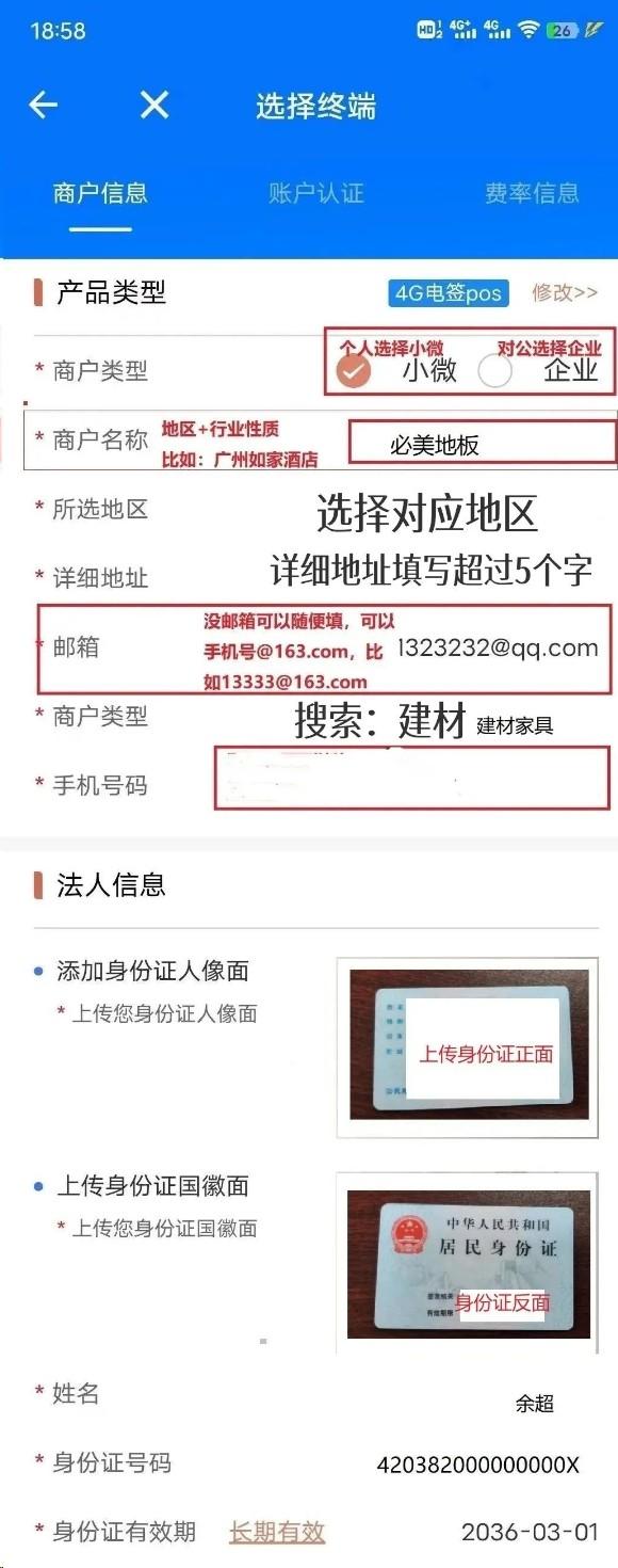 1、找到激活碼方法:微信掃機器后面白色二維碼——身份證后六位數字登錄——點首頁(下圖左下角)——點開商戶信息可以看到激活碼,機器輸入激活碼后按確定,大約20秒左右機器關聯成功就可以刷卡。