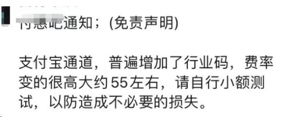 支付寶普遍增加了大額行業(yè)碼,費(fèi)率漲了0.55左右,請(qǐng)自行小額測(cè)試,以防造成不必要的損失。